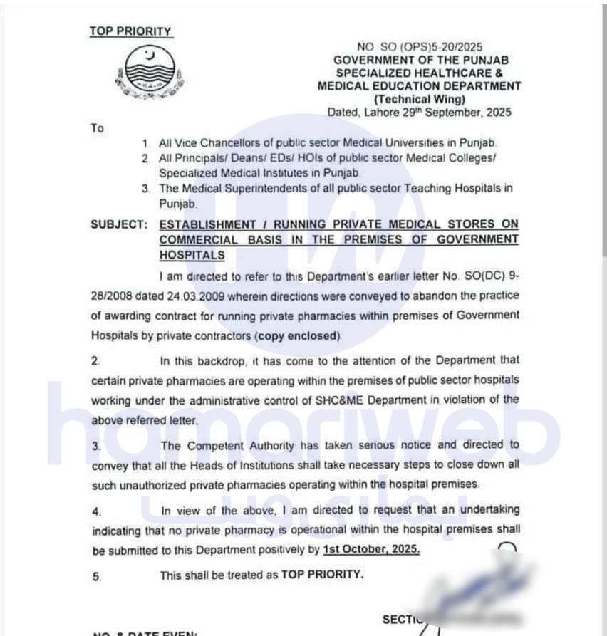 حکومتِ پنجاب نے صوبائی دارالحکومت لاہور کے تمام سرکاری اسپتالوں کی حدود میں قائم نجی میڈیکل اسٹورز اور فارمیسیز کو فوری طور پر بند کرنے کا حکم دے دیا ہے۔