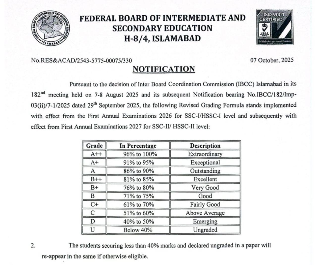 فیڈرل بورڈ آف انٹرمیڈیٹ اینڈ سیکنڈری ایجوکیشن نے طلبہ کی کارکردگی کو جدید تعلیمی معیار کے مطابق پرکھنے کے لیے نیا گریڈنگ فارمولا جاری کر دیا ہے۔ یہ نظام مرحلہ وار نافذ ہوگا۔ میٹرک کے امتحانات میں 2026 سے جبکہ انٹرمیڈیٹ کے امتحانات میں 2027 سے اس کا اطلاق کیا جائے گا۔